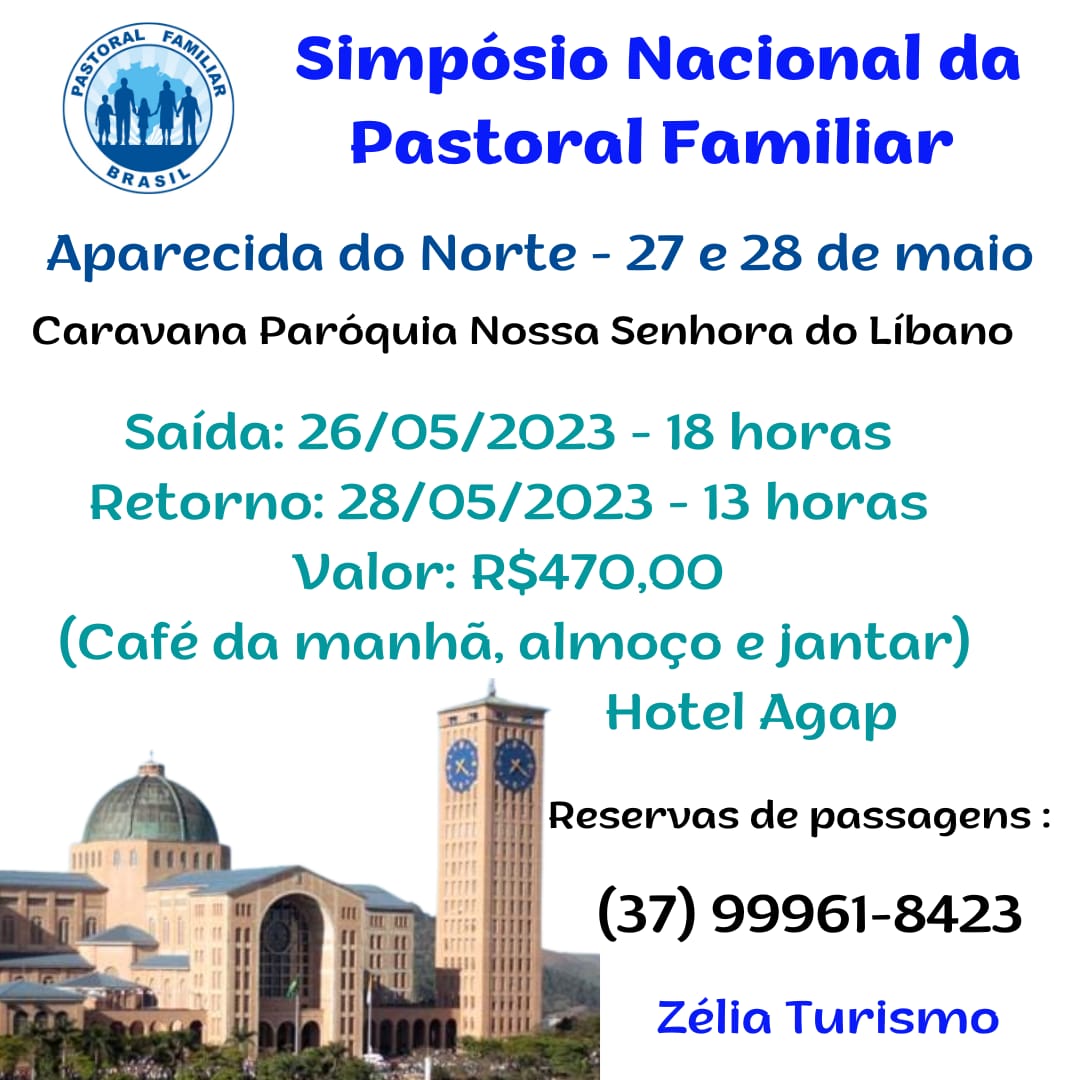 A Pastoral Familiar da Diocese de Divinópolis está organizando uma caravana, para reservas e mais informações entre em contato com Zélia Turismo: (37) 9.9961-8423