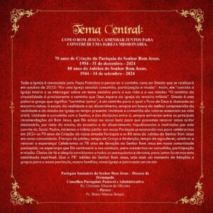 É tempo de jubileu, tempo de Graça e Redenção, tempo de agradecer, celebrar e renovar a esperança! Celebremos os 78 anos de devoção ao Senhor Bom Jesus em nossa comunidade paroquial, na esperança que Ele continuará a nos conduzir, para crescermos na comunhão, participação e missão.