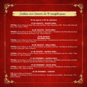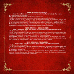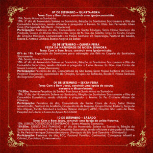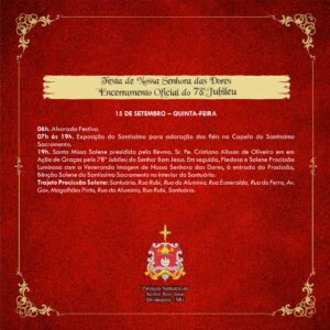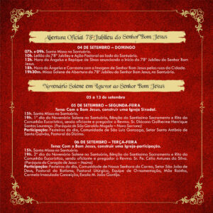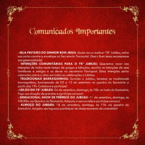 Cheios de fé e alegria convidamos a todos os paroquianos e devotos, para juntos fazermos esta caminhada espiritual. Que o 78º Jubileu do Senhor Bom Jesus, seja mais um momento de bênçãos e graças para a nossa paróquia, nossas famílias, nossa Igreja e para cada um de nós.