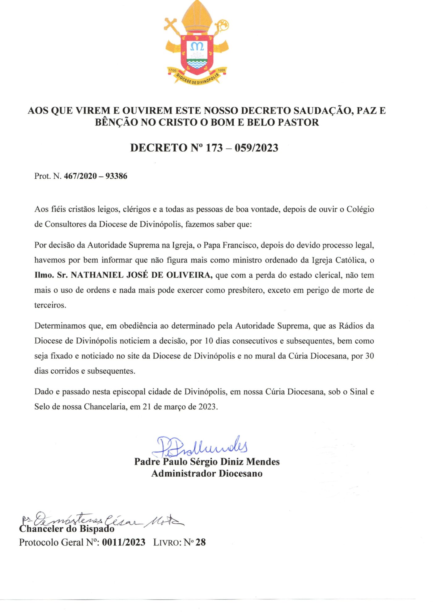 Aos fiéis cristãos leigos, clérigos e a todas as pessoas de boa vontade, depois de ouvir o Colégio de Consultores da Diocese de Divinópolis, fazemos saber que: por decisão da Autoridade Suprema na Igreja, o Papa Francisco, depois do devido processo legal, havemos por bem informar que não figura mais como ministro ordenado da Igreja Católica, o Ilmo. Sr. NATHANIEL JOSÉ DE OLIVEIRA, que com a perda do estado clerical, não tem mais o uso de ordens e nada mais pode exercer como presbítero, exceto em perigo de morte de terceiros. Determinamos que, em obediência ao determinado pela Autoridade Suprema, que as Rádios da Diocese de Divinópolis noticiem a decisão, por 10 dias consecutivos e subsequentes, bem como seja fixado e noticiado no site da Diocese de Divinópolis e no mural da Cúria Diocesana, por 30 dias corridos e subsequentes.