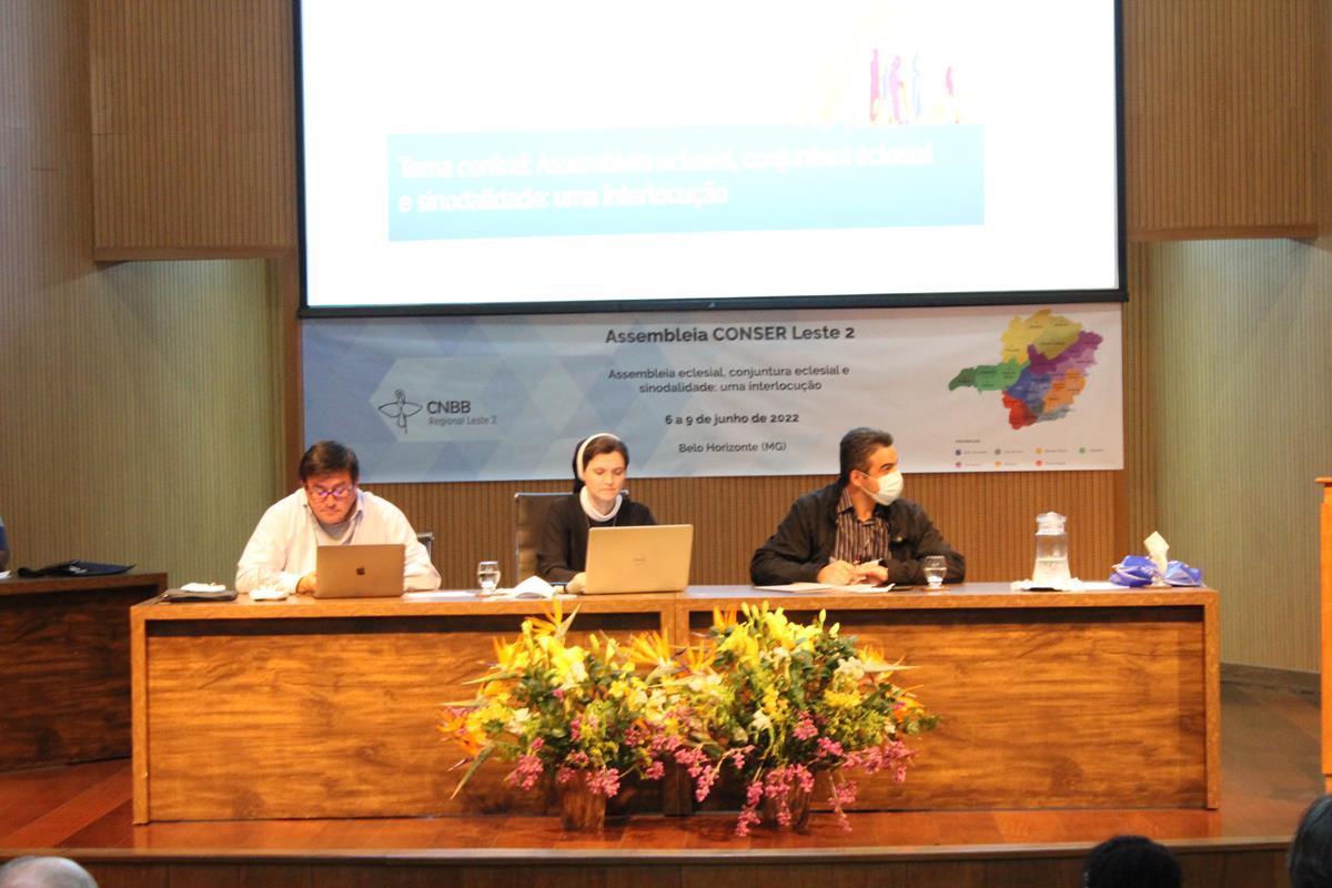 Na sequência, os três assessores: Ir. Valéria Andrade Leal, Pe. Boris Agustín Nef Ulloa e Pe. Júlio Cesar Evangelista Resende acompanharam a apresentação da síntese elaborada pelos grupos. A atividade abriu espaço para avaliação e debate dos pontos elencados nos trabalhos realizados desde o dia anterior.