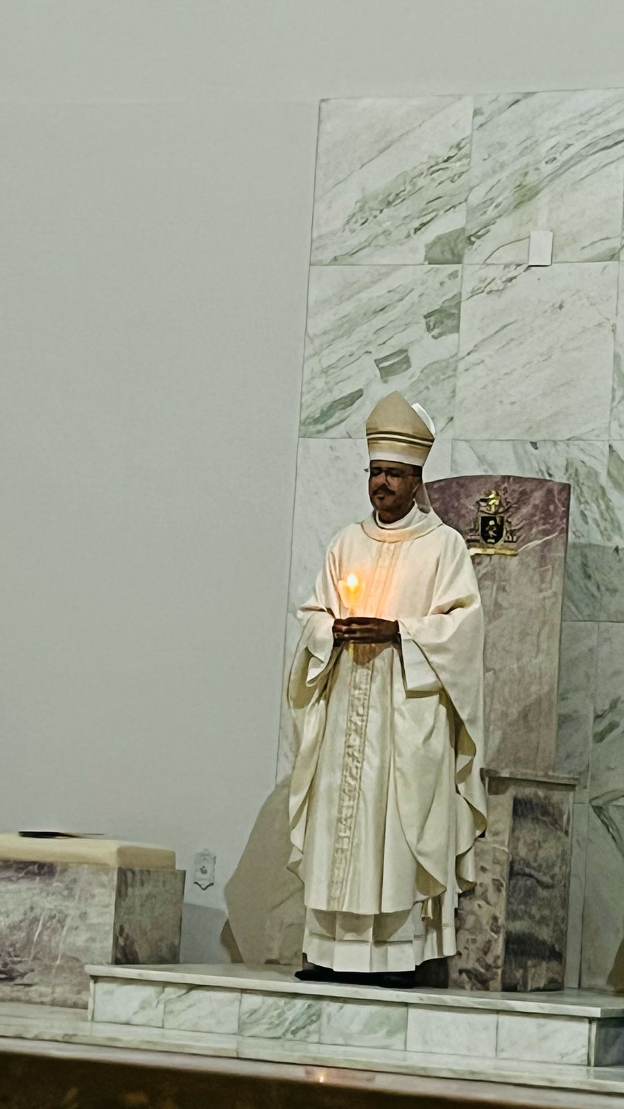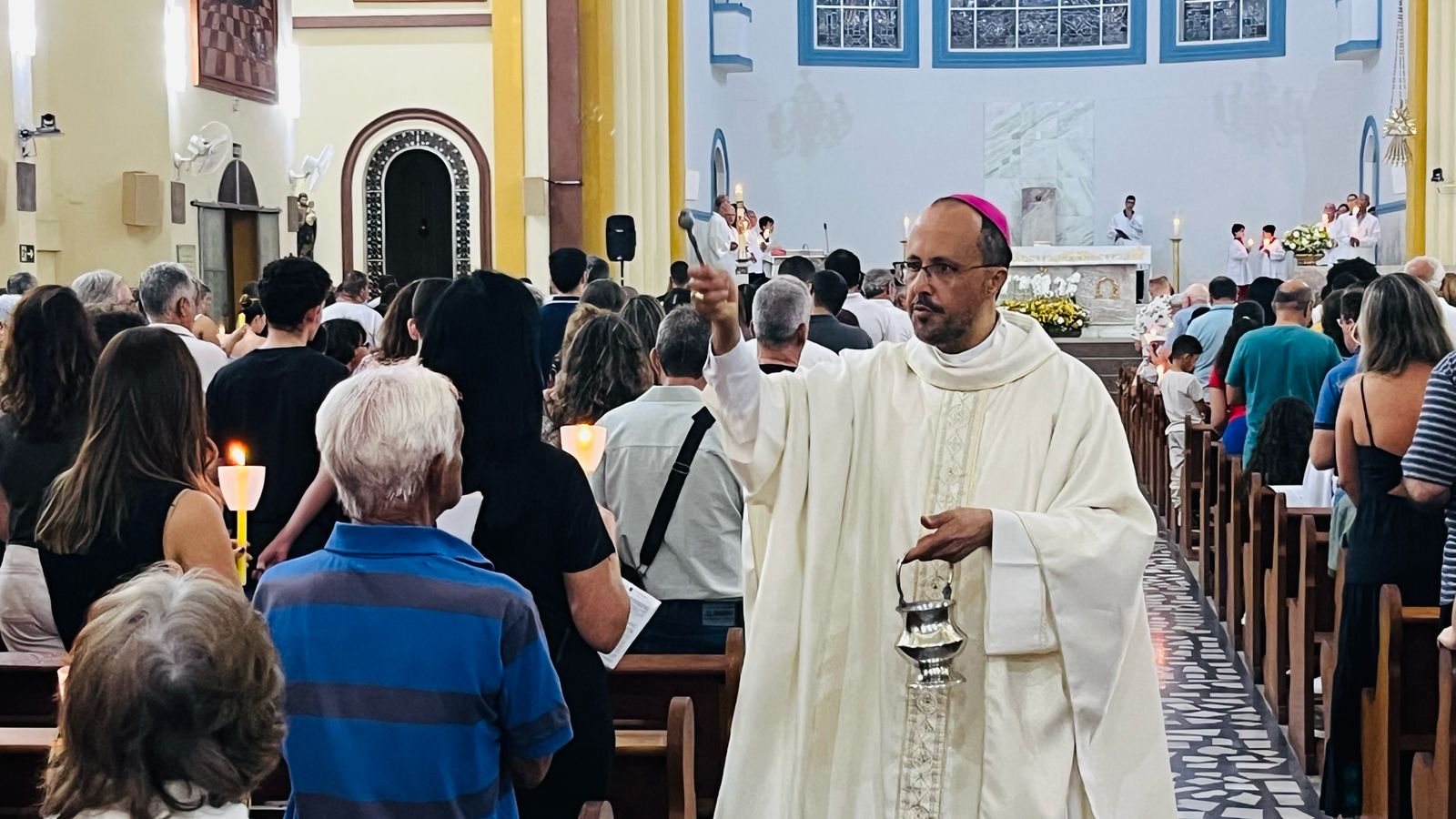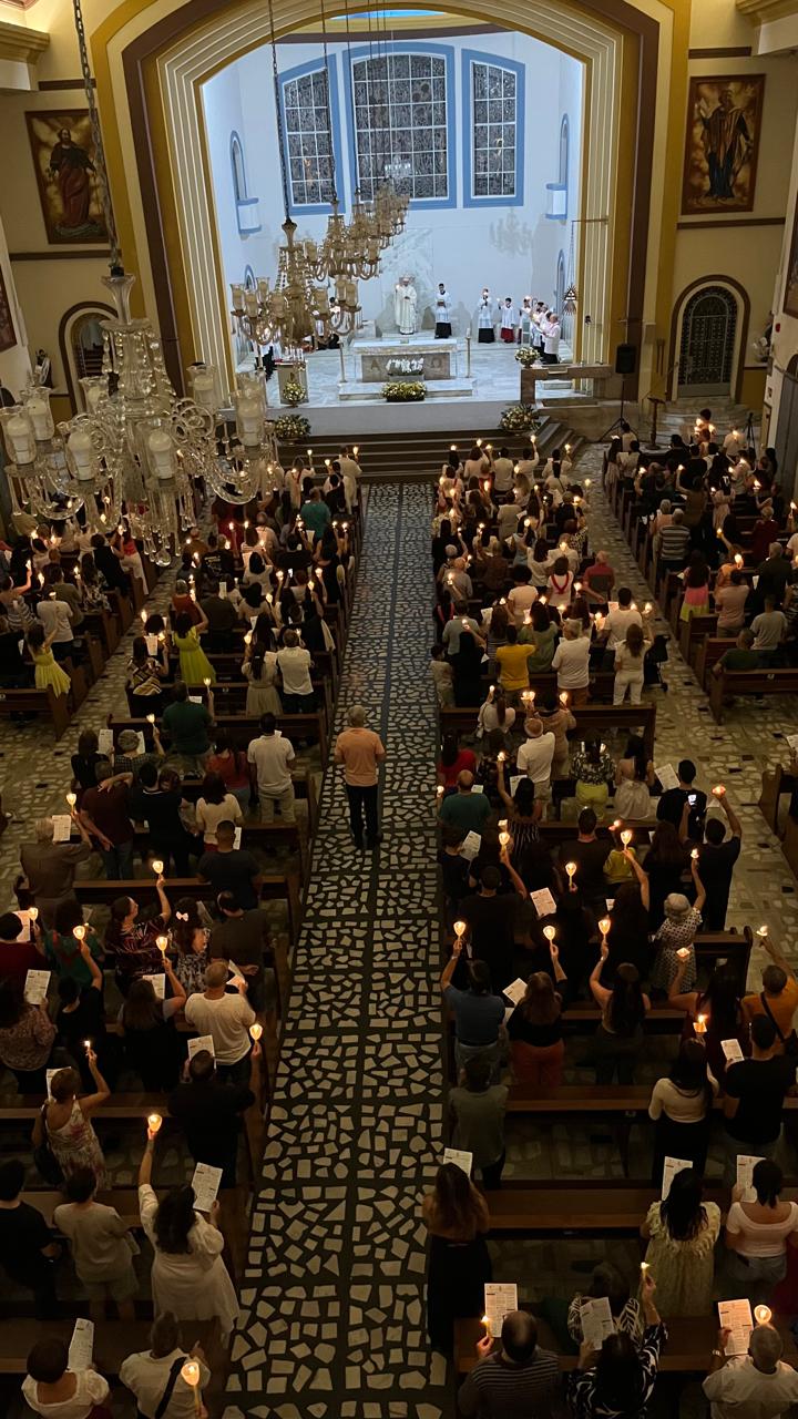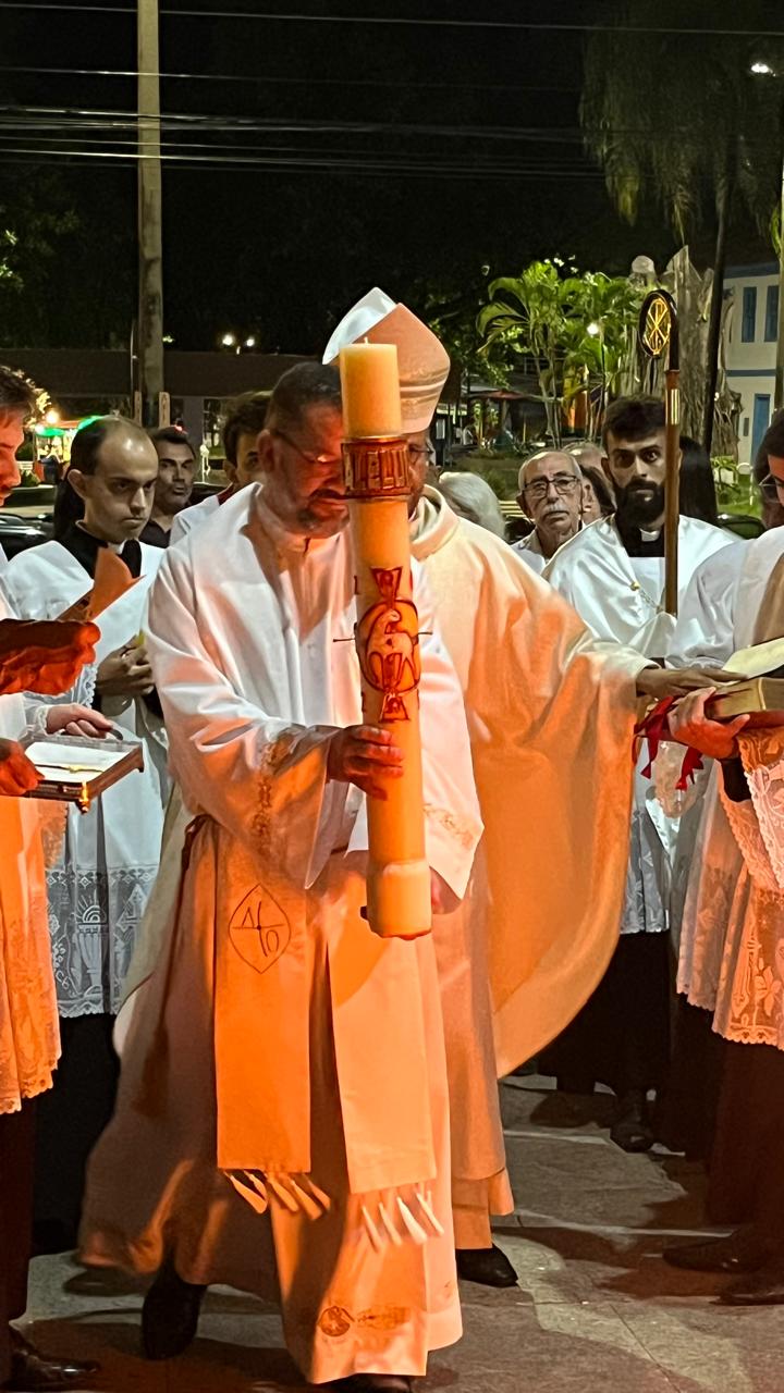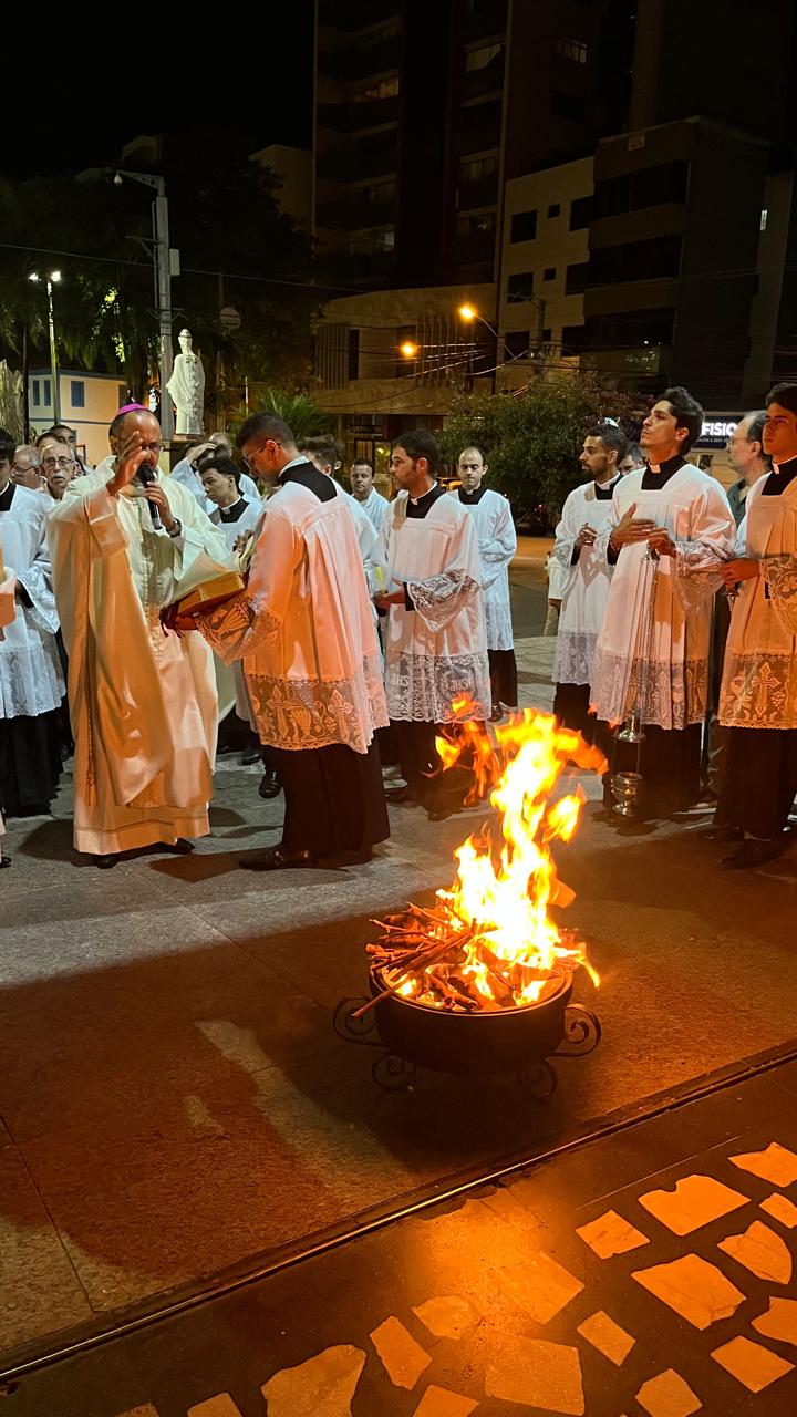 Foi com a Catedral do Divino Espírito Santo lotada que Dom Geovane Luís, bispo da Diocese de Divinópolis, celebrou a Vigília Pascal. A celebração começou às 19h com o rito da Benção do Fogo Novo e também o ato de acender o Círio Pascal, lembrou-se de “Cristo ontem e hoje, o princípio e o fim” – esta frase, junto com a inserção dos cravos, relembra as cinco chagas de Cristo e o significado de Sua ressurreição. A benção do fogo foi dada na porta da Catedral, porque uma chuva fina caía sobre a cidade.