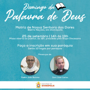 Acontecerá no dia 25 de setembro, na Matriz de Nossa Senhora das Dores, no bairro Nações, em Divinópolis, o Domingo da Palavra de Deus. Com início previsto para para as 14h, o encontro contará com a presença do Padre João Batista Gomes e de Dom José Carlos, que presidirá a Santa Missa de encerramento e que será aberta para todos.
