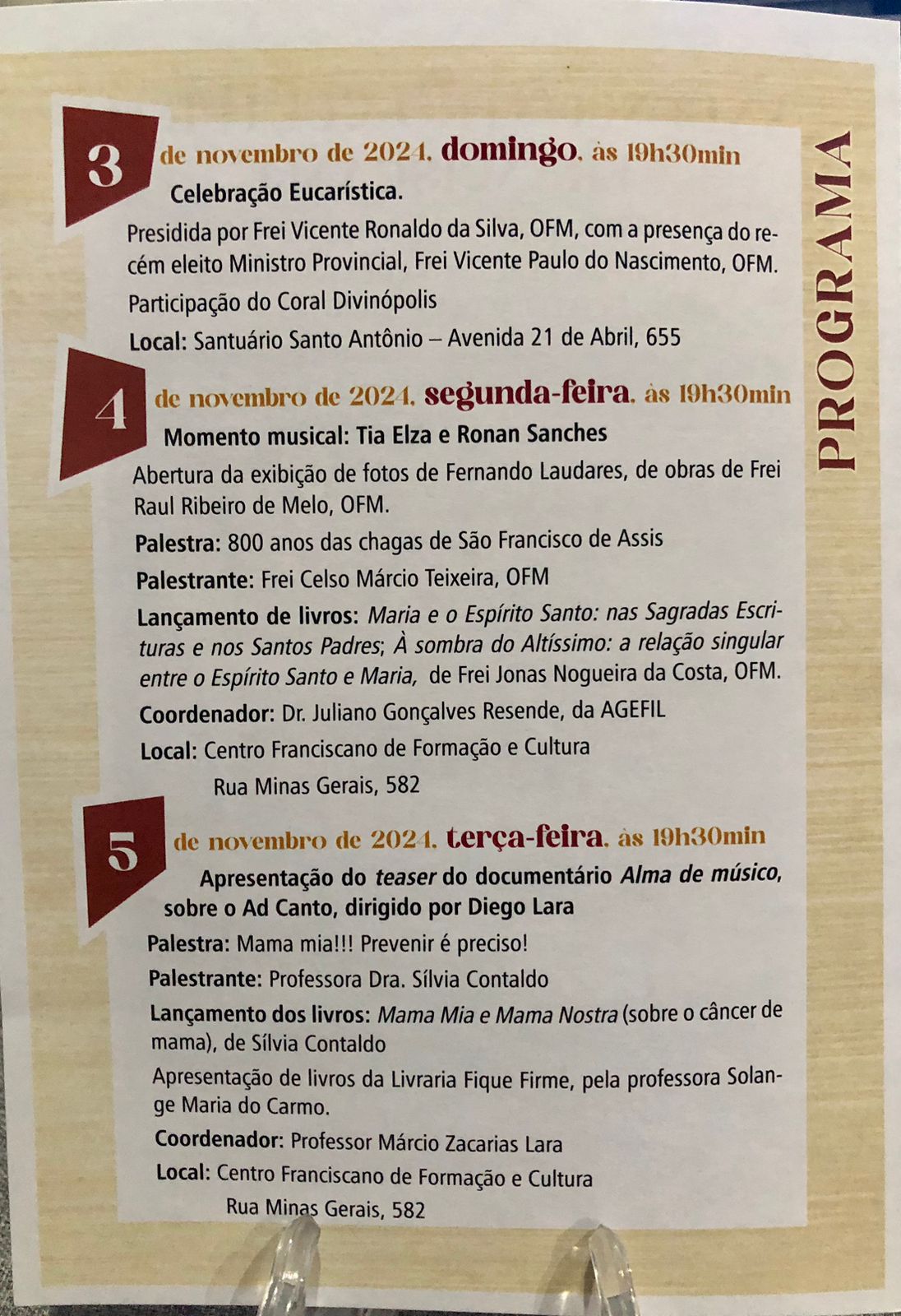 Neste ano, a promoção será realizada entre os dias 3 e 10 de novembro de 2024, e enfocará os temas: “Centenário da presença franciscana em Divinópolis”, “800 anos das chagas de São Francisco de Assis” e “Centenário de nascimento de frei Raul Ribeiro de Mello”. A maior parte das atrações do encontro será realizada no Centro Franciscano de Formação e Cultura (CFFC), rua Minas Gerais, 582, Divinópolis, com entrada franca.