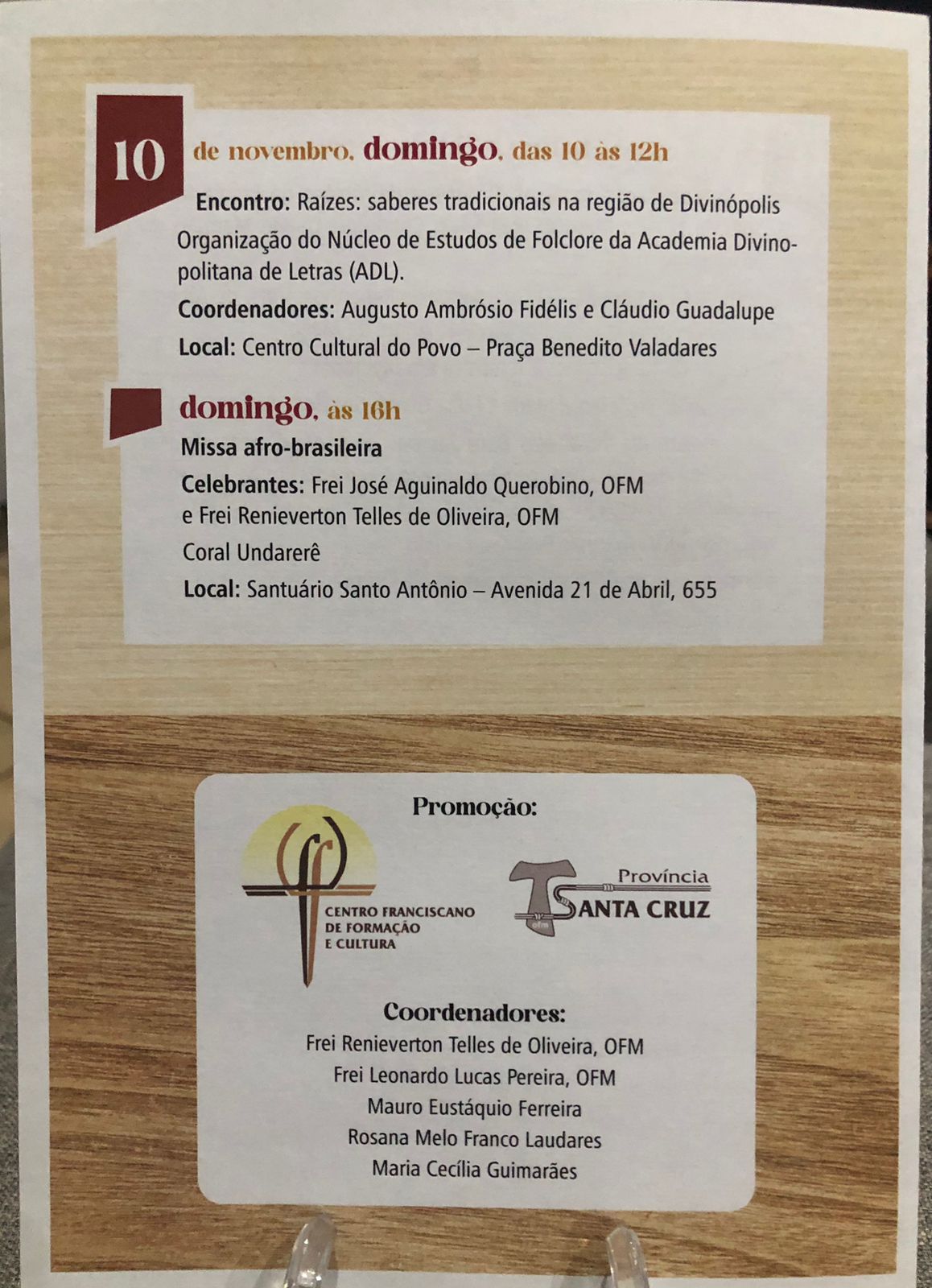 No encerramento do XXI Encontro Cultural Franciscano, o evento “Raízes: saberes tradicionais na região de Divinópolis” acontecerá no domingo, 10 de novembro, das 10 às 12 horas, no Centro Cultural do Povo (Praça Benedito Valadares), organizado pelo Núcleo de Estudos de Folclore da Academia Divinopolitana de Letras (ADL), com a coordenação dos acadêmicos Augusto Ambrósio Fidélis e Cláudio Guadalupe. Ainda, no domingo, às 16 h, será celebrada a Missa Afro-Brasileira por frei Vicente Ronaldo da Silva, OFM, com a participação do Coral Undarerê, no Santuário Santo Antônio (av. 21 de Abril, 655).