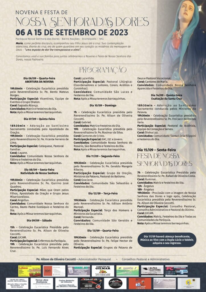 A paróquia de Nossa Senhora das Dores, em Divinópolis, convida os fiéis para a celebração da novena e festa em honra a padroeira.