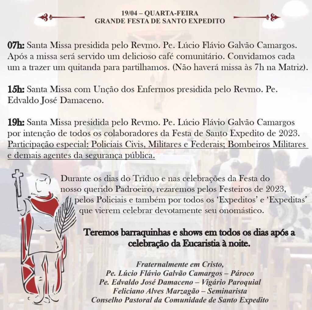 Festa de Santo Expedito é celebrada em Divinópolis, hoje, 19/04.