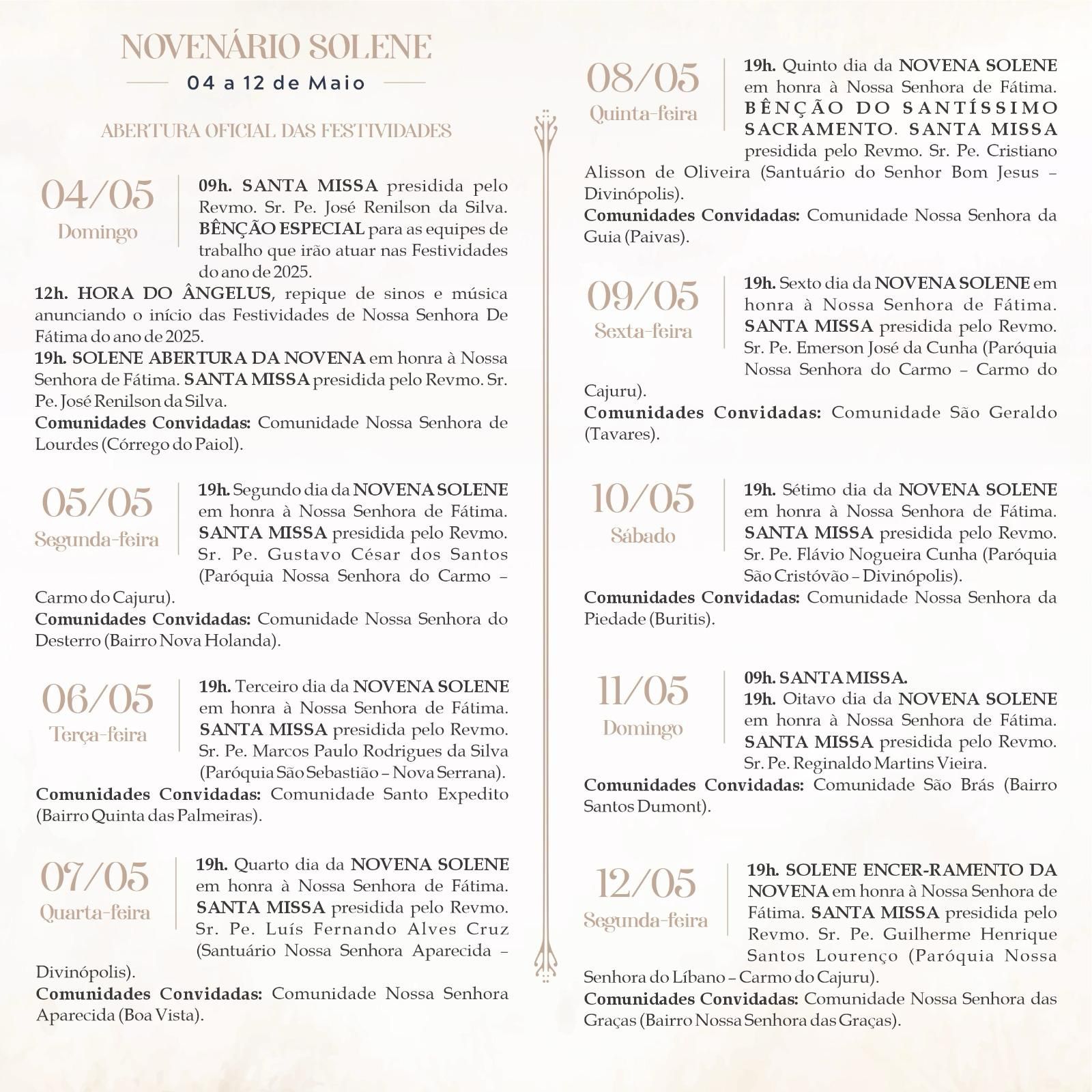Os padres Reginaldo Martins Vieira (pároco) e José Renilson da Silva (vigário) conduzem os devotos de 04 a 13 de maio pelo exercício da fé e devoção. Neste dia 04 a solene abertura da novena está marcada para as 19h e a comunidade Nossa Senhora de Lourdes (Córrego do Paiol) é a convidada. E assim a novena seguirá com missas às 19h, a cada dia com um padre convidado e também uma comunidade.