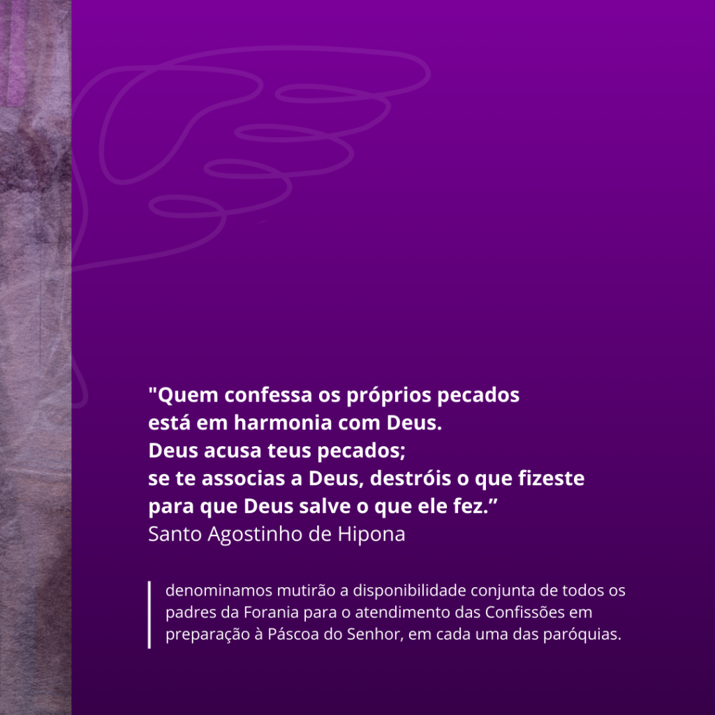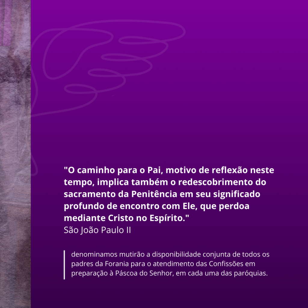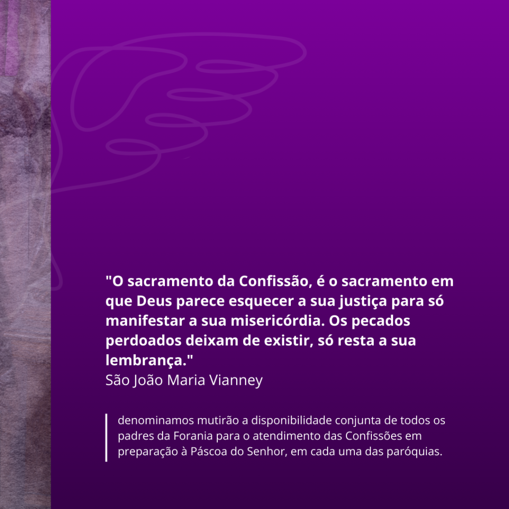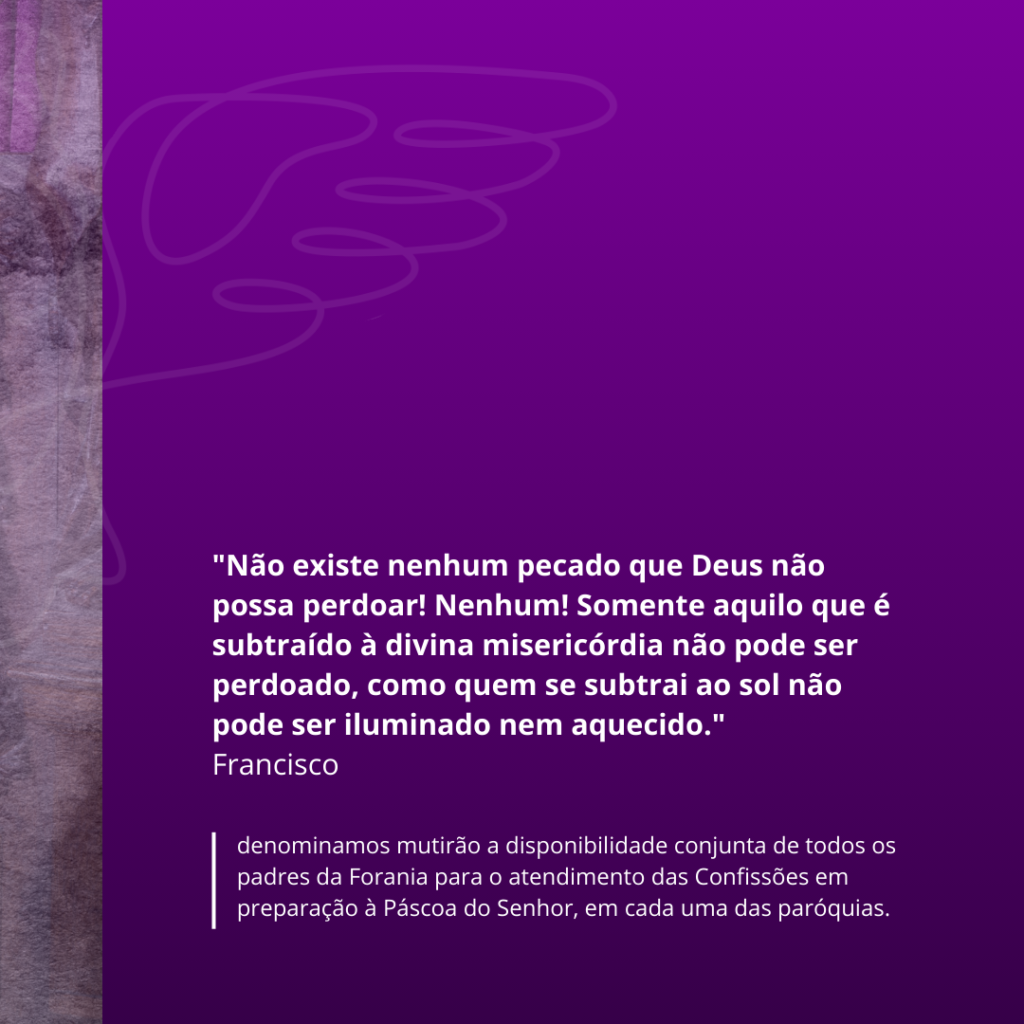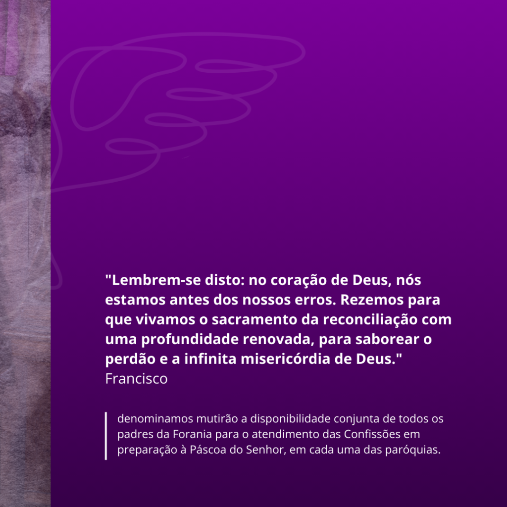 Denominamos mutirão a disponibilidade conjunta de todos os padres da Forania para o atendimento das Confissões em preparação à Páscoa do Senhor, em cada uma das paróquias.