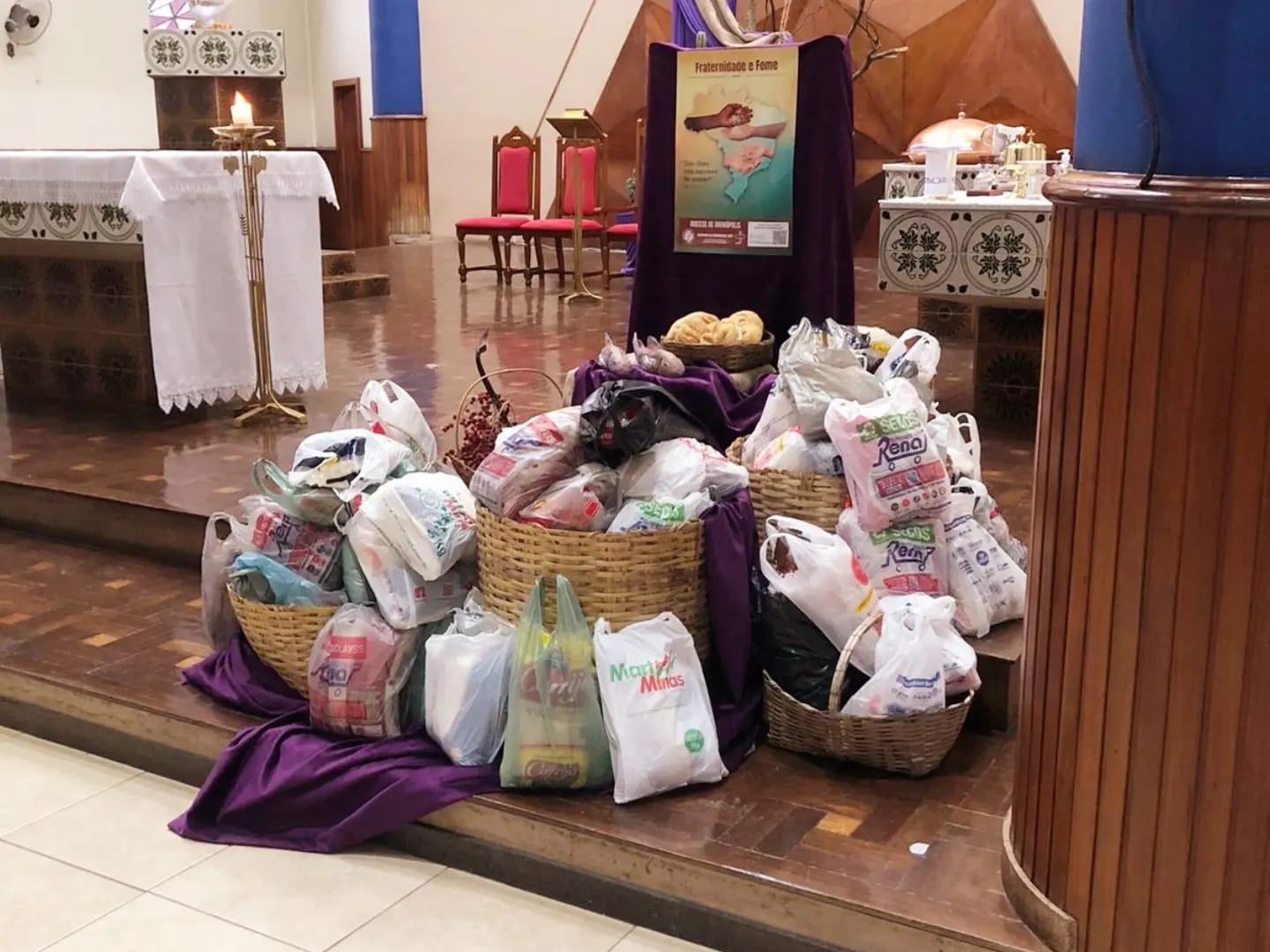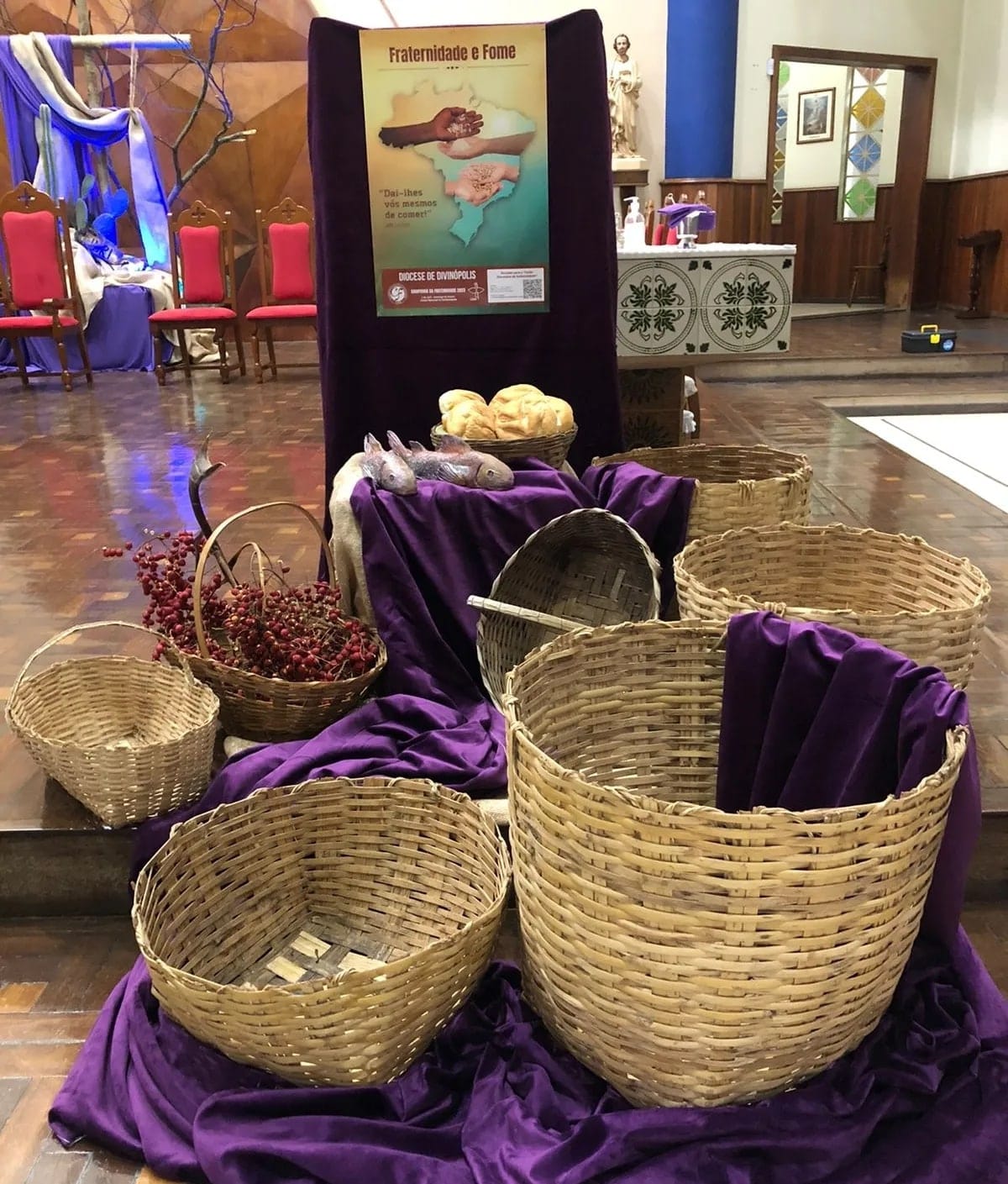 Na Matriz, de modo especial, foram postos os pães e os peixes, que nos recordam a multiplicação do alimento realizada por Jesus bem à frente das multidões famintas. Nela, aprendemos que a partilha do pouco de cada um se transforma no muito para todos! E a decoração da Mesa da Palavra nos diz que não só de pão vive o homem, mas de toda Palavra que sai da boca divina. Outra fome também deve ser cuidada: a do nosso desejo de Deus! Tudo convidativo para que andemos juntos nesta jornada quaresmal, ou seja, nestes dias que nos separam do Mistério Pascal de Jesus. Neste ano, a Igreja nos propõe, na Campanha da Fraternidade, a reflexão sobre a fome e o lema: “Dai-lhes vós mesmos de comer!” (Mt 14,16).