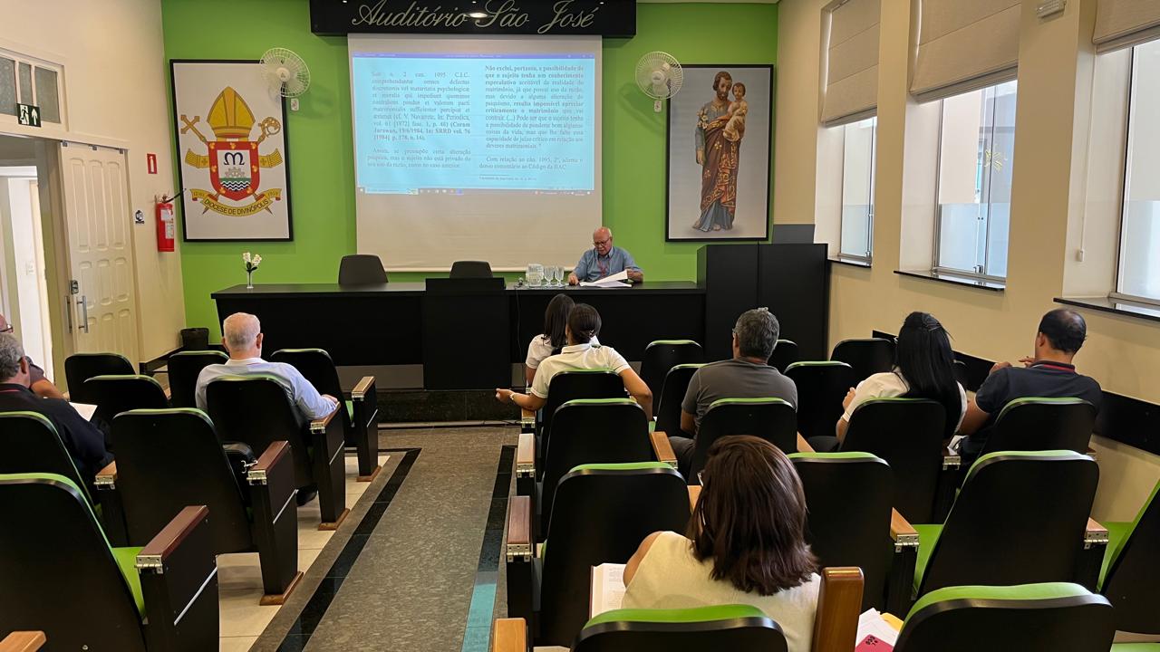 Participam a Equipe do Tribunal Eclesiástico, padres e advogados. Padre Vicente Ferreira Lima, vigário geral, ao dissertar sobre o assunto lembrou os deveres próprios do matrimônio, e afirmou que de modo geral o sujeito comum já tem consciência dos direitos e deveres no matrimônio, ou seja, tem o conhecimento prático da vida. Durante o encontro foram levantados alguns casos típicos que chegam ao tribunal, sendo muitos motivados por compromissos firmados sem a liberdade interna.